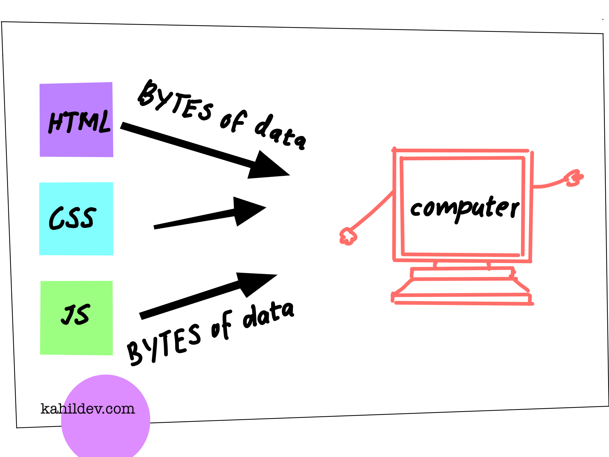 Let’s not forget these are computers we’re dealing with so the browser isn’t actually going to read the HTML itself, but rather it consumes the HTML as bytes of data and then converts that data into characters, which are further processed into tokens. So your browser sees HTML and it will trigger this chain reaction. HTML - bytes - characters - tokens. The browser then takes the tokens and creates a tree-like data structure that we refer to as the document object model, DOM.